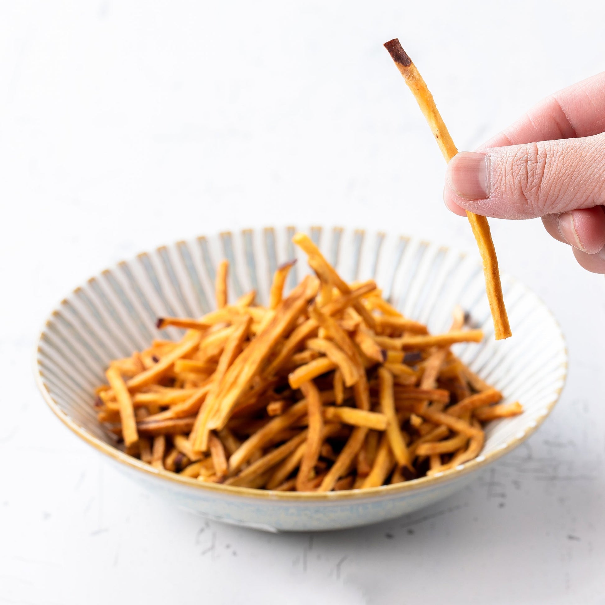 おいも日和の芋けんぴは、芋と砂糖と油でできています。 その3つの材料以外には味付けのエッセンスしか使わない、自然派のお菓子。 何よりもこだわっているのは、その細さです。通常の半分ほどの4mm。丁寧に細く切って手作業でカリッと揚げ、楽しい食感と自然な甘みをご提供します。