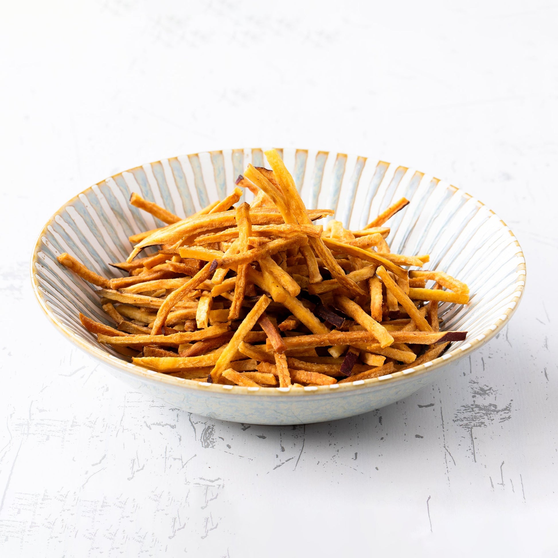 おいも日和の芋けんぴは、芋と砂糖と油でできています。 その3つの材料以外には味付けのエッセンスしか使わない、自然派のお菓子。 何よりもこだわっているのは、その細さです。通常の半分ほどの4mm。丁寧に細く切って手作業でカリッと揚げ、楽しい食感と自然な甘みをご提供します。
